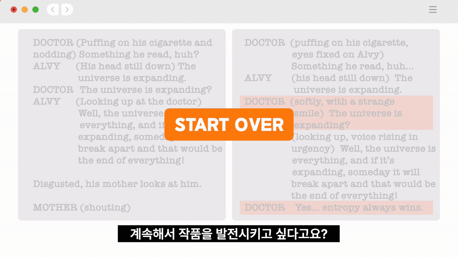 지치지 않는 무비볼 서비스로스트레스 없이 무제한으로 각색본을 받아보세요 STEP 1 수정하고 싶은 대본을 업로드 하세요. 원하는 각색 방향을 자유롭게 입력하세요. (장르, 캐릭터, 플롯 등) STEP 2 STEP3 무비볼이 알아서 각색해주고, 수정된 부분을 표시해 줍니다. STEP 4 보다 나은 버전을 원한다면, 만족할 때까지 무제한으로 이용하세요!